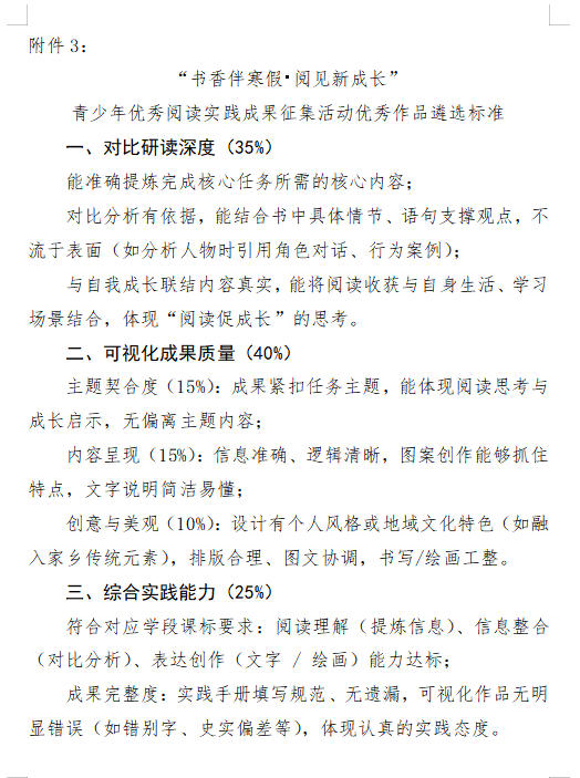 3.“书香伴寒假・阅见新成长” 青少年优秀阅读实践成果征集活动优秀作品遴选标准
