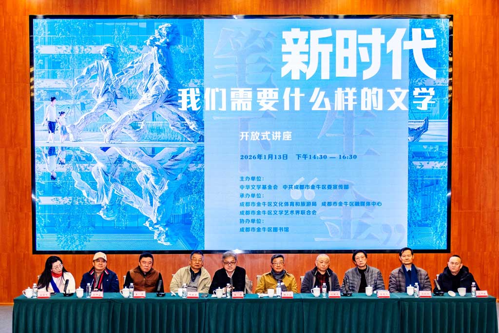 2026年1月13日下午,由中华文学基金会、中共成都市金牛区委宣传部联合主办的“新时代全国文学名家座谈会”在成都市金牛区图书馆举行。十余位来自全国各地的作家、诗人、文学评论家,齐聚一堂,围绕“新时代我们究竟需要怎样的文学”,探讨了文学面临的基本境况,共谈文学与时代、人生与创作的种种话题,并与参加座谈会的观众热烈交流。座谈会由诗人、学者石厉主持。